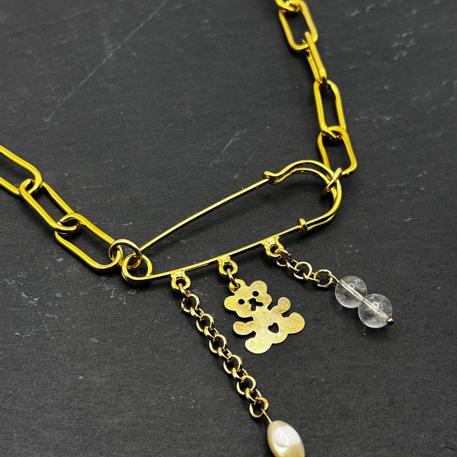 For those who want to give cute but edgy - Handmade safety pin pendant that features 14k gold plated teddy bear, garden quartz and yellow mother of pearl on high grade stainless steel paperclip chain.