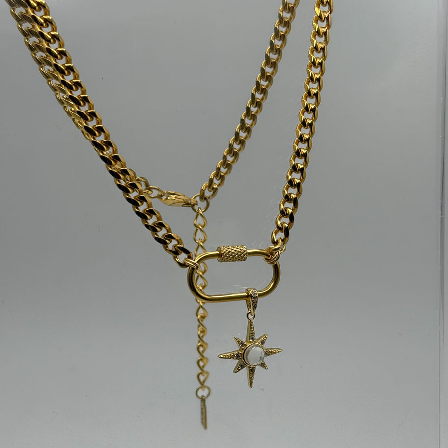 Handcrafted and set with an AA-grade Brazilian rainbow moonstone, this necklace rests on a sleek 316L stainless steel gold curb chain for a modern, tarnish-resistant finish. Perfect for layering with other necklaces or wearing solo as a bold statement piece, this design is one-of-a-kind and is crafted only once.