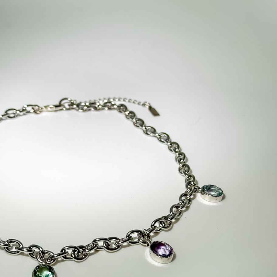 Stunning Mexican Rainbow fluorite "gumdrop" charms anchored on a sleek 316L stainless steel round chain for a modern, tarnish-resistant finish. Wear it solo as a statement piece or layer it for elevated edge. This one-of-a-kind design is crafted only once.